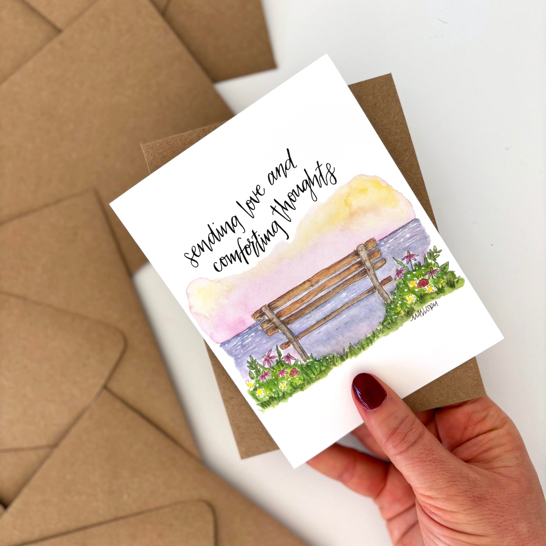 Sending Love and Comforting Thoughts depicts a beautiful, calming scene of a bench overlooking the water. This sweet sympathy card is a kind way to send your sentiments. Original design made with pen and watercolor on paper.